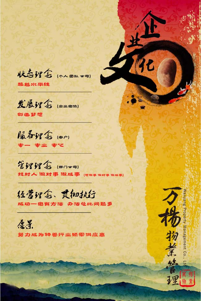 我們的企業(yè)是一個(gè)充滿活力,奮發(fā)向上的團(tuán)體,我們的宗旨是創(chuàng)造一個(gè)優(yōu)秀的物業(yè)管理企業(yè),為業(yè)主提供滿意和高尚的服務(wù)品質(zhì),我們將每一位員工都看成我們事業(yè)的重要組成部分,企業(yè)以擁有你們這些員工為榮。因此,我們希望我們的員工都能盡善其職,愿我們的每一位員工都能以自己是“萬楊人”而驕傲。 |